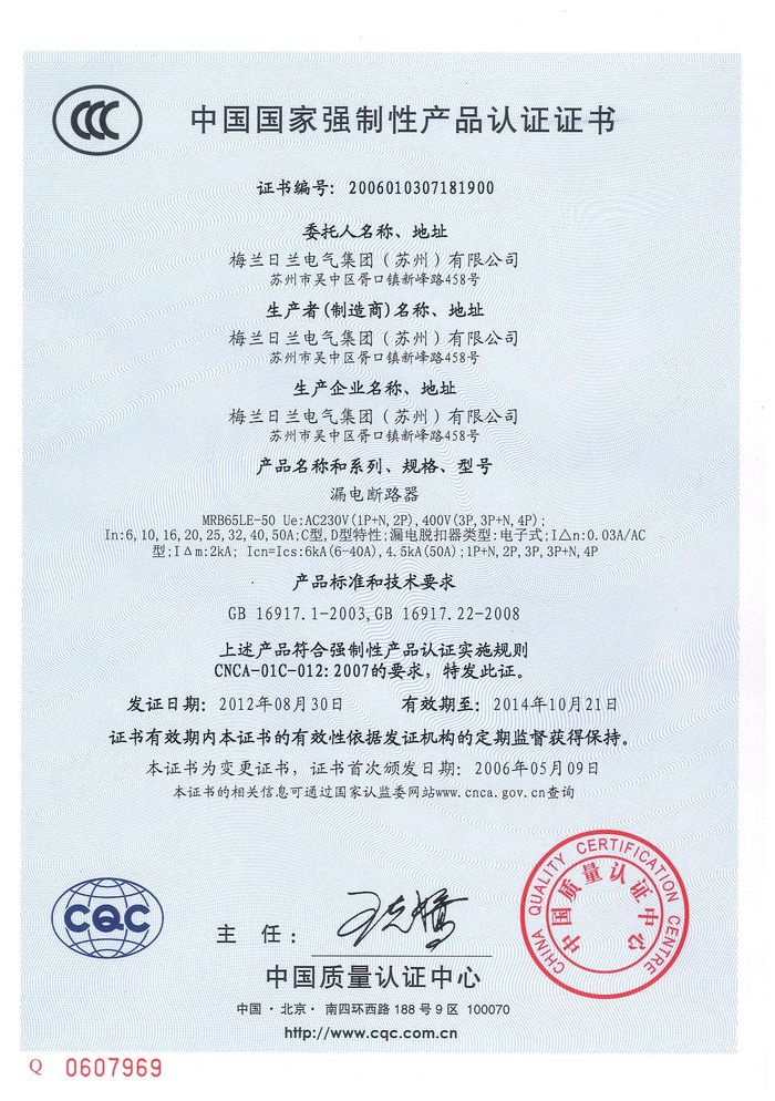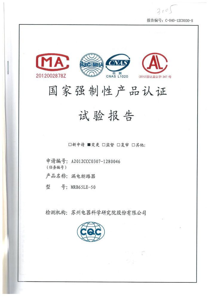 MRB65LE-50漏電斷路器資質(zhì)證書(shū)