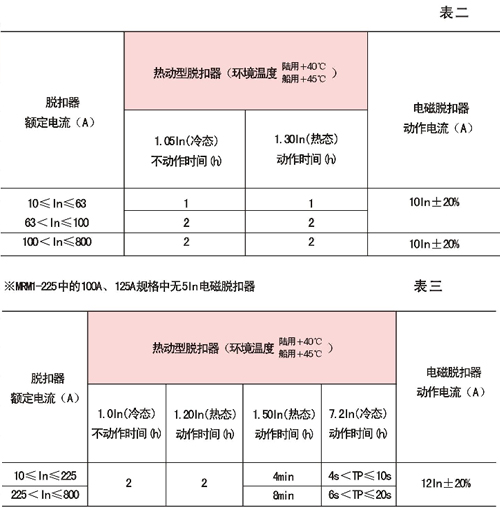 斷路器熱動型脫扣器具有反時(shí)限特性;電磁脫扣器為瞬時(shí)動作,特性見表二(配電用)及表三(保護(hù)電動機(jī)用)
