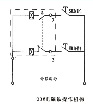 CDM電磁鐵操作機(jī)構(gòu)(配用MRMl-63,100,225)接線圖見下圖(虛框內(nèi)為斷路器外符號說明:SBi、SB2操作按鈕(用戶自備)