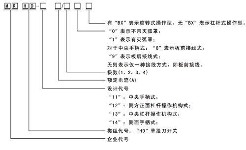 MRHD系列單投刀開(kāi)關(guān)適用于交流50Hz、額定電壓至380V、直流至220V,額定電流至3000A的成套配電裝置中,作為不頻繁地手動(dòng)接通和分?jǐn)嘟弧⒅绷麟娐坊蜃鞲綦x開(kāi)關(guān)用。其中: